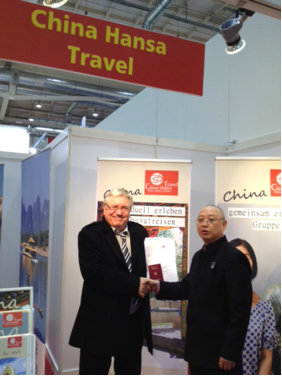 Herrn Chen und mich auf seinem Stand der Reisemesse Hamburg.